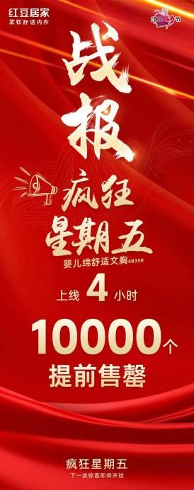 紅豆有禮,約“惠”七夕。7月下旬,在第24屆紅豆七夕節(jié)IP的強(qiáng)力加持下,紅豆居家通過精心策劃的“瘋狂星期五”營(yíng)銷活動(dòng),每周精選一款兼顧舒適悅己與高性價(jià)比優(yōu)勢(shì)的品質(zhì)好物,限時(shí)秒殺、限量搶購,掀起了現(xiàn)象級(jí)消費(fèi)熱潮。首波主推的嬰兒綿舒適文胸在短短10小時(shí)內(nèi)狂銷1萬件,第二波活動(dòng)更攀新高,創(chuàng)下4小時(shí)售罄1.2萬件文胸的驕人戰(zhàn)績(jī),再次證明了“紅豆”品牌背后的硬核產(chǎn)品力和強(qiáng)大市場(chǎng)吸引力。